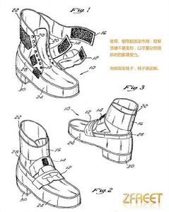 (圖一)整個鞋後跟的仰視圖,示意底部的V型凹槽,這是高科技的核心部分。 | (圖二)鞋子的整體外觀示意圖,鞋帶、鞋舌、鞋幫、繃帶都不是一般的長,穿過高幫軍用靴沒?就是這感覺。 |