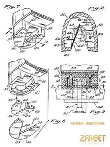 Fig.8:鞋底的三層結構,從上到下為:鞋跟部分,提供V型口(44)的空間;固定夾層(52),通過螺帽與鞋跟固定,起到V型口的主要固定作用;底層(40),與鞋跟契合,能起到次要固定作用,並能穩固夾層(52),我估計還有另外一個重要作用,提供正常的鞋跟功能——平滑與防滑。