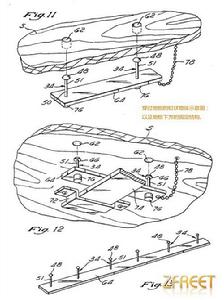 Fig.9:整個裝置與地板結合的示意圖,釘狀物體的螺帽(48)剛好能卡在V型口中,這兒是整個裝置受力的關鍵部分。