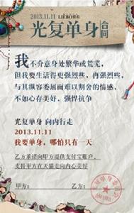 光復單身契約旨在號召女性通過簽訂契約,給自己一天時間“單身”,尋回如單身時的心態和感覺,去體驗和享受自我價值實現。簽訂契約方式:授權用戶新浪微博賬戶,然後選擇一個合適自己的光復單身的理由,並選擇另外一半的微博賬戶,就會自動生成一款光復單身契約。裂帛版契約