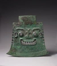 1965年山東益都蘇埠屯出土。寬弧刃,平肩,寬短內,有穿,飾鏤空人面紋,眉、眼、鼻、耳、口、牙俱全,形象威猛。