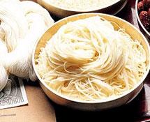 3、此時半成品切面還不宜烹製食用,還需有個“吸水”過程。即將冷水沖晾後的面分成10份盤在碗中(目的是保持半成品外形美觀,展示時能吸引顧客)再倒扣在細眼面篩中,面上加蓋濕布(以免風吹使局部麵條脫水變硬)靜置3小時以上。 切麵食用時的烹製以熱拌最為簡便,因而也是居家最樂意採用的方法。熱拌的做法是將多量的水旺火燒開後下入麵條,煮開透心裝盆,調入醬油、精鹽、味素、蒜頭醋(蒜泥加香醋混合浸漬)、蔥頭油(豬油加蔥白炸香)、蔥花等拌均勻即成。
