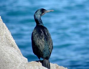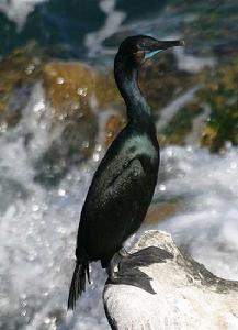 加州鸕鶿加州鸕鶿是一種黑體的鸕鶿,體長:70—79厘米;翼展度:108厘米;重量:1400-2700克。有一個帶鉤的細長喙和黑色的長尾巴。在繁殖季節,脖子的後面長出少許白色羽毛,頦下生出藍斑。成鳥全身黑色,頸部向胸部的過渡區略淺。而幼鳥的羽毛是棕黑色。雌雄羽毛顏色幾乎完全相同,雄鳥體型略大。