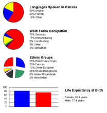 城市人口占總人口的69.1%。而在多倫多、蒙特婁和溫哥華這三個加拿大最大的城市居住的人口占總人口的35%。加拿大人口主要為英、法和其他歐洲國家後裔,土著居民(印第安人、米提人和因紐特人)約占3%,其餘為亞洲、拉美、非洲裔等。來自印度、巴基斯坦和斯里蘭卡的南亞移民人口達到130萬,超過華裔成為加拿大最大的少數族裔。華裔人口中25%的人是在加拿大本土出生的,其餘大部分來自中國大陸、香港和台灣,2011年有華人約145萬人。