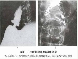 在病變的急性期或慢性球部潰瘍的發作期,球部腸壁由於水腫而表現為密度減低,腸壁增厚,外緣輪廓模糊,水腫還可表現為腸壁的分層現象。這一改變在治療後,可看到水腫消退,腸壁輪廓清楚。這些影像學表現對於解釋臨床症狀和評價治療效果都有一定的幫助。