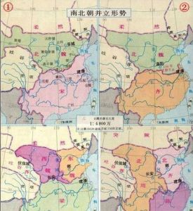 南北朝侯景之亂後,北齊占領江北淮南之地,西魏占領漢中巴蜀。西魏又受蕭詧之託,率軍奪下南朝梁江陵以北之地,建立附庸國西梁。南朝陳成立後國土不多,至569年開始陸續收復淮南及部份淮北之地,並且一度奪下北齊長江以北之地(573年—577年)。到陳末時受北周入侵使得國土減少,僅剩長江以南至交廣地區。