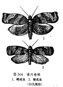 成蟲 體長 11-13 mm,翅展雄蛾 19-25 mm,雌蛾 23-34 mm。全體黃褐或暗褐色。前翅淡黃褐色,基斑、中橫帶、端紋及網狀紋均為暗褐色,雄、雌的斑紋略d有不同,雄蛾前翅近四方形,前緣格很長,起自前緣的 1/6處,外線稍呈弧形拱起,項角圓釣,翅面上常雜有黑褐色鱗片,中橫帶下部向外增寬;後緣 1/3處有 1個黑斑,在中胸後緣也有 1個黑斑,中室占全翅長的 4/5。雌蛾前翅延長呈長方形,前線凸出,在近頂角處凹陷,到頂角處又凸起;外線中部顯著凸起,項角突出。中室占全翅長的2/3—3/4。後翅灰褐色,項角黃色。 卵 黃綠色,橢圓形,扁平,數十粒排列成魚鱗狀卵塊,卵粒比棉褐帶卷蛾的卵大而厚。 幼蟲 老熟幼蟲體長 23-25 mm,黃綠色或綠色,頭部、前胸背板及胸足新鮮標本為黃褐色,浸泡後的標本除頭部仍為黃褐色外,前胸背板及胸足都變為黃白色或淡黃色。頭殼上具有栗褐或褐色斑紋,側後部的斑紋最明顯;前胸背板側緣有2塊明顯的棕色斑,但有的個體也不明顯;後織中間(中線兩側)各有1塊暗紅褐色斑。胸足附節或股節褐色。腹部末端具臀措。肛上板呈倒亞葫蘆形。頭部單眼區大部分呈黑色;單眼6枚,除單眼1卵圓形外,其餘5枚都呈圓形;比較大,VI最小。上顎分5齒,其中4齒銳,1齒鈍;具有內齒。 蛹 體長 10—13 mm,紅褐色,胸部背面黑褐色,背中線明顯呈綠色,第七至第十腹節的節間為黑色。觸角長不過中足的末端,後足末端與翅芽等齊。蛹的頂端突出,末端細而齊,具有8枚彎曲、強壯的臀棘,側面各2枚,末端4枚集中。