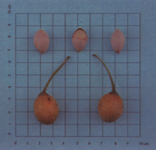 “南林果2”種核形態為佛指形,核形係數1.61,果長卵圓形,熟時淡橙黃色,被薄白粉,多單果。先端圓鈍,基部蒂盤近正圓形,珠孔跡小,平或稍下凹,少數具小尖,基部蒂盤近正圓形,果基部略見偏斜。果柄長3.94cm,果縱徑2.47cm,橫徑1.98cm。種核長卵圓形,先端尖削,具禿