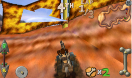 一路黑煙直衝終點,賽車有前進和倒退兩個檔,還有剎車。途中可以收集骨頭道具,你可以選擇往前扔或者往後扔。