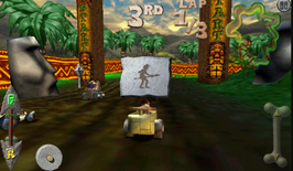 Cro-Mag Rally的畫面風格迥異,以9種風光作為賽道背景,色調也不如古惑狼賽車的色調明快,並將古老的原始人和希臘克里特島、中國的長城、沉沒的亞特蘭蒂斯等完全不著邊際的地點跨越時空地扯在一起,看似傻帽卻別有一番味道。