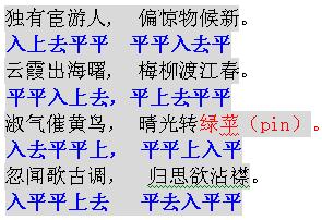 入聲的消失也導致了古、今音聲調的不同。一部分古入聲字變成了現在的上、去聲字,還屬於仄聲,我們可以不管;但是另有一部分入聲字在國語中卻變成了平聲字(陰平或陽平),這就值得我們注意了。前面“天子萬福”的“福”字就是這種情況。