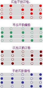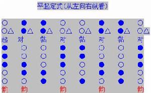 按董文煥制譜:以二四六句為主,每體各為四句,平列四句,每二四六各字,自相排比,隔句對粘對,皆兩平兩仄,其一平一仄者即轉,凡本句為起承皆一平一仄,其兩平兩仄者為拗,粘對者橫數,起承者豎數。