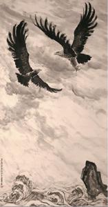 《英雄交響曲》表現以強烈而真摯的情感,以物喻人書寫內心的激情,寄予胸中的志向,畫面雄魂奔放,採用簡潔淋漓的筆墨,狂寫出代表中華民族精神的雄鷹在萬里長空中勇猛搏擊,衝破烏雲,在無際的時空中自由翱翔,表現出生命的搏擊和追求人生競自由的理想浪漫主義色彩的美感。