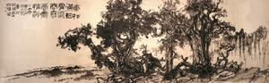 古代唐、宋大家多畫古柏,明代畫家文徵明、唐寅善畫柏樹,並多加庭院書樓以增加文人氣息,近代大家吳昌碩、齊白石酷愛古柏,多以簡筆、飛白、枯墨寫之,有蒼老質感。我畫古柏一改古往的表現風格,以禿筆逆峰、鐵線鋼條來表現滄桑霸氣之感,古柏生命歷經風雨,千年不衰,他訴說著人間的滄桑,見證著歷史的痕跡,根盤大地,矗立人間,人們喻它是龍的延身,這不正是中國民族之魂嗎。古有米芾拜石,今有我輩終拜千年古柏。觀柏、畫柏學古創今,深為中華大地千年古柏而陶醉也。
