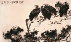 君壽先生善畫動物,蒼鷹、禿鷲是他的最愛。《遠矚江山圖》中的禿鷲取材於生活在西藏的黑色大禿鷲,它方大的體廓和蒼勁的羽毛正是體現傳統筆墨技法功力之所在,古松襯托著巨石,群鷲盤踞在山頂顯現出英雄氣勢,那昂起的鷲頭,炯奕的眼神,以及群鷲視向同一方的敏捷,興奮至極,呼之欲出,全景達到了貫神的巔峰。