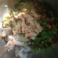 4. 青椒、胡蘿蔔和豆芽切成小丁焯水然後和蝦肉、鮪魚肉拌勻並加入適量的鹽和雞粉調味。