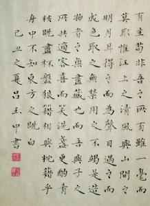 俗話說:內行看門道,外行看熱鬧。我不懂書法的體式、筆鋒,更不懂書法的傳統、流派。初見呂玉中的小楷,見筆筆娟秀,字字端莊,恍然如一排排蛾眉星目的江南女子整束待閱,清麗可人。又恍若三春桃花,二月柳枝,令人耳目一新。然觀全幅作品,結構嚴謹,剛勁有致,其勢內含,清冽有君子之氣。再看呂玉中的行書,一幅之中,字字變幻,筆筆藏鋒。或輕盈如雲,或婀娜如柳,或狂舞如飛天,或敦厚如老納。或急或緩跌宕起伏之間,一支悠揚的樂曲從字裡行間裊裊升起,繚繞於耳際。心生艷羨之餘由衷地讚嘆:這需要多少功夫才能達到如此爐火純青的藝術境界?不知他用禿了多少筆,熬過了多少夜,渡過了多少清貧寂寞的日子?記得呂玉中曾經說過,他最喜歡在淅淅瀝瀝的雨天寫字。我相信已知天命的呂玉中經過了歲月沉浮,睿智的心多了一份澄澈,多了一份理性,多了一份從容。在窗外如詩般紛飛的雨中,思想和藝術都得到了詩意的升華。