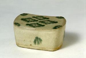 枕長方形,圓角,一側有孔。枕面白釉地,中央以綠彩繪4朵菱形花紋組合成的大菱形圖案,四角又各繪小朵花紋。釉面開細小紋片,底無釉。