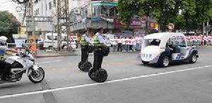 單人警用巡邏車是酷似哪吒的“風火輪”的新設備,名為“賽格威”,這種巡邏車的中文名叫“思維智慧型移動代步設備”,是美國人狄恩·卡門的Segway公司開發的具有自主平衡能力的交通工具。