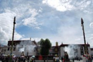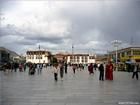 大昭寺前廣場大昭寺不僅僅是一座供奉眾多佛像、聖物以使信徒們膜拜的殿堂,它還是佛教中關於宇宙的理想模式――壇城(曼陀羅)這一密宗義理立體而真實的再現。在大昭寺的正門人口處前面,有三根石柱。一根石柱上用漢藏兩種文字刻著公元823年簽訂的唐蕃會盟書。