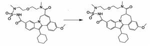 大環吲哚的結構式可用於HCV病的防治製備路線該化合物為系列化合物的核心中間體 例子1如右圖該化合物由義大利一家公司研發,目前已在世界主要經濟體----歐美、日本、中國、印度具有專利。 臨床套用該化合物已處於臨床1期