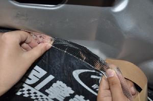 使用大能引擎罩覆膜時,應當先將它切割成需要的形狀,再將其背襯揭開。切割時可以使用剪刀、刀或沖模。安裝表面上的灰塵、油污、水漬和其它異物都必須清除乾淨。最簡單的貼裝方法是稍稍彎曲覆膜,然後順著材料的最短邊將它貼上在工作面上。