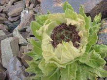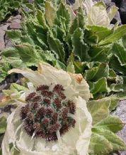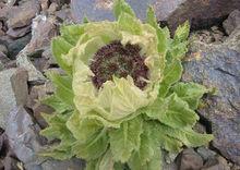 植物形態: 多年生草本,高10~30cm。莖粗壯,基部有許多棕褐色絲狀殘存葉片。葉密集,無柄,葉片倒披針形,長10~13cm,寬2.5~4.5cm,先端漸尖,基部抱莖,邊緣有鋸齒。頭狀花序頂生,密集;總苞片葉狀,卵形,多層,近似膜質,白色或淡綠黃色;花棕紫色,全為管狀花。瘦果,冠毛白色,刺毛狀。花期7月。生於高山石縫、礫石和沙質河灘中。分布於新疆、青海、甘肅。