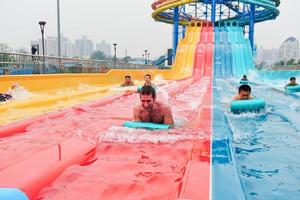 環渤海地區首台極速衝刺滑道,想像一下從19米高自由下落到水中的感覺!近乎垂直90°的炫酷滑道,讓人還沒體驗就情不自禁尖叫出聲。風馳電掣般的急速墜落速度,讓您在大聲吶喊中釋放無限激情,盡情感受垂直失重的極限快感。