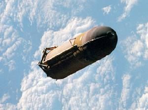 即太空梭,它是整個系統的核心部分。軌道器是整個系統中惟一可以載人的、真正在地球軌道上飛行的部件,它很像一架大型的三角翼飛機。它的全長37.24m,起落架放下時高17.27m;三角形後掠機翼的最大翼展23.97m;不帶有效載荷時質量68t,飛行結束後,攜帶有效載荷著陸的軌道器質量可達87t。它所經歷的飛行過程及其環境比現代飛機要惡劣得多,它既要有適於在大氣層中作高超音速、超音速、亞音速和水平著陸的氣動外形,又要有承受再人大氣層時高溫氣動加熱的防熱系統。因此,它是整個太空梭系統中,設計最困難,結構最複雜,遇到的問題最多的部分。