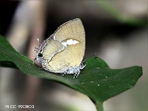 (小灰蝶科)小型,翅膀表面暗褐色具藍色的斑紋,前翅藍色斑較光亮,上方尚有1枚白色的大型斑紋;翅腹面褐色,前後翅各具一縱向的大型條狀斑,後翅斑紋向翅外緣擴...