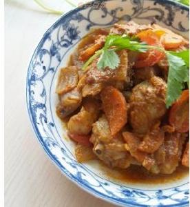 3、鐵鍋放入2湯匙的油,燒熱油,放入娘惹咖喱雞醬炒香;