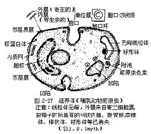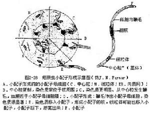 :在其生活史中經過兩個寄主。裂體生殖時期寄生在脊椎動物或人體內(血液中或細胞中),配子生殖和孢子生殖是在吸血的節肢動物(蚊或蜱)體內。由於其整個生活史在寄主體內進行,所以孢子無殼,如瘧原蟲。又如在我國巴貝斯焦蟲(Babesia)和泰勒焦蟲(Theileria)①70000034_0059_0對家畜均有危害,可引起家畜患焦蟲病。焦蟲有許多種,通常寄生在家畜的紅血細胞內,蟲體呈圓形、環形、梨形(單個或成對)等不同形態(圖2—30)。不同的家畜各有其一定的焦蟲致病,彼此互不感染,其中以牛焦蟲種類最多,其它家畜的較少。病原體通過硬蜱傳播。當被感染的硬蜱吸取家畜血液時,焦蟲即可進入家畜的紅血細胞(泰勒焦蟲先進入淋巴細胞和組織細胞中繁殖,再進入紅血細胞內寄生),然後以二分裂或成對出芽法進行繁殖(圖2—30)。當紅血細胞破裂後,蟲體再侵入其它的紅血細胞。如此反覆進行,破壞大量紅血細胞。嚴重時一部分血紅蛋白由腎排出,成為血尿。焦蟲在蜱體內發育繁殖較複雜,有些具體過程尚不完全清楚或無一致結論。有些種類在蜱內發育一段時間後,一部分蟲體侵入蜱的卵巢,隨著蜱卵的形成,被包在卵內,並藉此傳遞給下一代,當蜱的幼蟲到家畜體上吸血時又傳給家畜。或者不經過卵傳遞,蜱在幼蟲或若蟲階段吸血感染焦蟲,焦蟲即在蜱體內發育繁殖,等蜱長成若蟲或成蟲吸血時再傳給家畜。焦蟲對家畜危害較大,有的死亡率可高達90%。