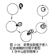 (一)在人體內(進行裂體生殖)瘧原蟲在肝細胞和紅血細胞內發育。有些學者把在肝細胞發育分為紅血細胞前期和紅血細胞外期。有些學者把紅血細胞前期稱為紅血細胞外期。在紅血細胞內發育包括紅血細胞內期及有性時期的開始(配子體形成)(圖2—24)。