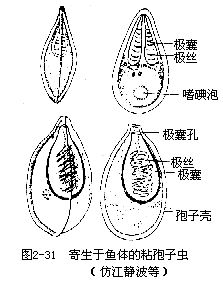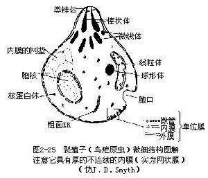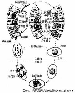 :這類孢子蟲多寄生於脊椎動物消化器官的細胞內。生活史與瘧原蟲的基本相同,不同的是,它只寄生在一個寄主體內,卵囊必須在寄主體外進行發育。孢子有厚壁。主要寄生於羊、兔、雞、魚等動物體內。如兔球蟲,寄生在肝膽管上皮細胞的為兔肝艾美球蟲(Eimeria stiedae)(圖2-29),寄生在兔腸上皮細胞的有穿孔艾美球蟲(E.perforans)等。據調查我國至少有9種兔球蟲,這幾種球蟲一般多混合感染,對家兔危害很大,尤其對斷奶前後的幼兔更為嚴重,有時可引起家兔大量死亡,對養兔業是很大威脅。其生活史與瘧原蟲基本相同。即兔誤食了卵囊(感染階段)後,子孢子在小腸內從囊內出來,侵入肝膽管的上皮細胞或腸上皮細胞內發育成滋養體,進行裂體生殖。過一段時期後產生大小配子母細胞,進行配子生殖,形成合子,在其外分泌厚殼,稱為卵囊,卵囊隨糞便排出體外。在合適的外界條件下卵囊發育,核分裂形成4個孢子母細胞,每個孢子母細胞外分泌外殼,成為4個孢子,每個孢子內又分裂成為2個子孢子,即每個卵囊內有8個子孢子。在此階段的卵囊,如被另一兔吃下就可被感染,或者重複感染。卵囊對外界條件的抵抗力很強,根據實驗,用濃度低於1%的石炭酸、高錳酸鉀、來蘇兒以及飽和鹽水和鹼水等不能殺死卵囊,但用80℃以上水處理可使卵囊迅速死亡,因此用開水洗刷兔籠及用具或用80℃~100℃高溫處理是預防此病的有效措施。