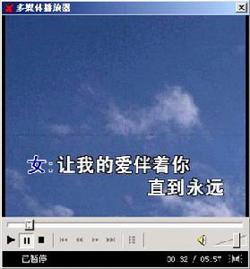 多媒體播放器用於播放多媒體音頻檔案,可以打開監視多媒體檔案的播放情況。一般情況下不需要手工打開。如果多媒體檔案包含了視頻軌,那么在打開該多媒體檔案時,該播放器會自動顯示。這對使用一些包含有卡拉OK音頻的節目比較方便,比如卡拉OK VCD視頻檔案,在製作時可以對照它本身帶的歌詞。