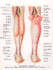 皮膚移動性小,血液供應差,損傷後創口癒合較慢。淺筋膜疏鬆且含少量脂肪,彈性差,輕度水腫時,臨床多在內踝上方指壓檢查.易顯壓痕。淺靜脈為大隱靜脈及其屬支,在小腿上部,隱神經居靜脈的後方,在小腿下部則繞過靜脈至其前方。腓淺神經於小腿外側中、下1/3交界處穿出深筋膜至皮下。深層結構