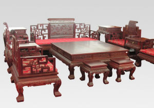 紫檀亦稱青龍木,屬蝶形花科,亞熱帶常綠喬木,主要產於印度及馬來半島、菲律賓等地,中國兩廣、雲南一帶也有少量出產。紫檀的材質緻密堅硬,體重,入水則沉,一立方米木材可達703公斤。色調呈紫黑色(暗犀角色),微有芳香,深沉古雅,心材呈血赭色,有光澤美麗的回紋和條紋,年輪紋路成攪絲狀,棕眼極密。無痕疤。用酒泡則紫色出,並可粘到碗上。其樹脂或木材削片和銼末入藥,可治瘡毒。紫檀木主要用作製造高級家具及其它精巧器物。紫檀木樹種雖多,但它們有許多共同特點,尤其是色彩,都呈紫黑色,製作紫檀家具多利用其自然特點,採用光素手法。因紫檀木色調深沉,顯得穩重大方而美觀,如果雕花過多,掩蓋了木質本身的紋理與色彩,就如同畫蛇添足了。