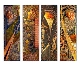 此展品為現代文物,每幅高3.5米.寬1米這四幅作品是中國最大的疊鑲藝術銅壁畫,取材於中國神話故事《山海經》,分別為:“夸父追日”、“女媧補天”、“精衛填海”、“大禹治水”。