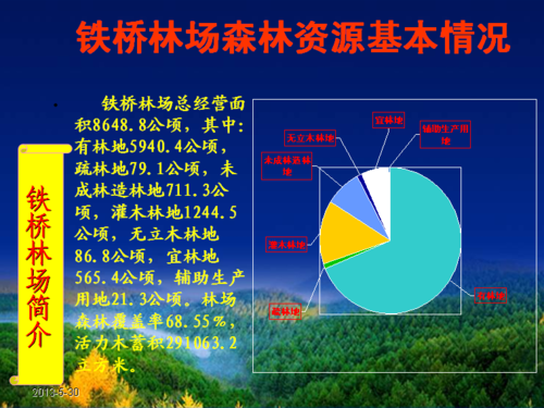 林場經營範圍跨涉和順縣馬坊鄉全部。總經營面積8648.8公頃,其中:有林地5940.4公頃,疏林地79.1公頃,未成林造林地711.3公頃,灌木林地1244.5公頃,無立木林地86.8公頃,宜林地565.4公頃,輔助生產用地21.3公頃。林場森林覆蓋率68.55﹪,活力木蓄積291063.2立方米。