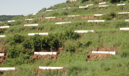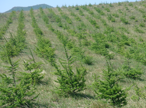 整地:儘量少採用魚鱗坑的造林整地方式。提倡採用 “品”字型塊狀或穴狀方式進行造林整地。造林:加大闊葉林營造林比例,提倡營造針闊混交林。生態脆弱區尤其是坡度較大時,山頂帶“帽”(保留山頂的現有林分)以提高區域森林生態防護效能。
