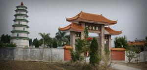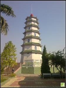 該塔塔體總建築面積310平方米,塔身共七層,高度從地坪至葫蘆頂共28.65米,投資90多萬元。塔基座分二壇,首壇占地面積748平方米,高2.8米,第二壇高1.5米。地理位置