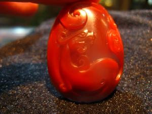 紅顏色與白色相伴生,比如常見的紅白蠶絲料,其中紅白分明者罕見,通過巧妙的設計雕刻,可達到意想不到的藝術效果。