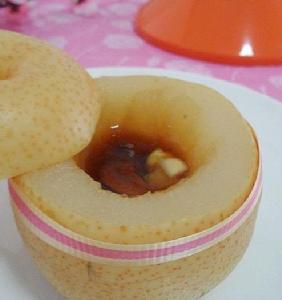 12.至飄出中藥和雪梨混合的香味,取出揭掉1/3的雪梨蓋即可食用。