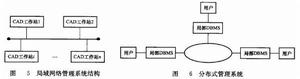 為適應遠程多用戶的需要而發展起來的分散式管理系統如圖6所示。這是當前工程數據管理系統的一種新技術,採用先進的網路通信、局部資料庫和系統資料庫相結合的工作方式,克服了基於局部區域網路進行工程數據管理系統的缺陷,但隨之由於無中心數據詞典(難以建立這種詞典),又給保證數據的完整性、實現並發管理帶來困難,並且當一個節點破壞時常常有需要重新構造系統的危險。