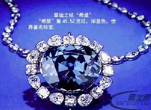 曾經轟動全球的美國電影"鐵達尼號"中有一件叫“海洋之心”的鑲有巨大藍色鑽石的項鍊,其實就是令人聞風膽寒的藍色"希望之鑽",此鑽是世界上現存最大的一顆藍色鑽石,重45.52克拉。目前,該鑽石藏於美國首都華盛頓史密森尼博物院的國立自然博物館中。在傳說之中,這顆鑽石是從佛像上強行摳下來的,所以受到了詛咒,成為一顆給擁有者帶來不幸的噩運之鑽。