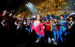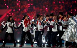 8分鐘表演的尾聲,參與索契冬奧會的韓國運動員,如速度滑冰名將李相花、短道速滑名將沈石溪等人跑入舞台,與演員一起狂歡。此時,光影效果打出2018年冬奧會會徽。隨著燈光逐漸變暗,舞台中心打出“平昌見(See you in Pyeongchang)!”