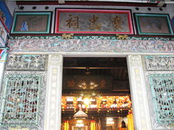 平鎮的義民廟正門,建築充滿客家風格平鎮褒忠祠(義民廟):客家人精神寄託所在的褒忠祠位於義民里,擁有國內最大的天然神像-福祿壽財神爺的福明宮,供奉的是開漳聖王的建安宮,涌光里的涌光寺是平鎮市早期唯一純靜修佛學的禪寺,最大的土地公廟為廣隆宮。