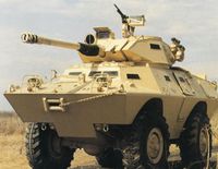 9.裝90mm火炮炮塔的康曼多車該車開始安裝的是比利時梅卡火炮,目前安裝的是柯克里爾MK3火炮及7.62mm並列機槍和炮塔頂高射機槍。炮塔系電液控制,可360-旋轉,主炮俯仰範圍為-8-~+28-,迴轉和俯仰速度可達30-/s。觀察設備包括炮塔左側2個、右側1個觀察鏡、360-旋轉的車長潛望鏡、放大倍率為8-的炮長潛望鏡和帶有投影分劃的整體式潛望鏡。裝有50萬燭光的聚光燈。車載90mm炮彈39發,其中炮塔內有8發。戰鬥全重9.888t,乘員3名,可載步兵4名。