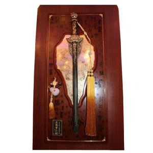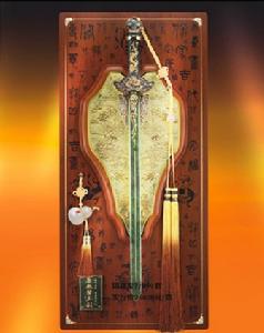 史無前例的第一次採用,崑崙山和田玉(碧玉),純手工精雕而成。劍長70公分,寬3-4公分,通體碧綠無暇、溫潤細膩,劍身鎏光佛光火焰紋,寓意薪火相傳,時代興旺:劍柄採用五福之首—‘蝙蝠’造型,寓意神龍護佑:劍把雕刻—青龍、白虎、朱雀、玄武,寓意中國傳統四方神獸護衛:劍飾的白玉葫蘆,雕刻康熙御筆”天下第一福“!寓意天賜洪福、福澤天下。整把玉劍鑲嵌6顆天然綠松石,懸掛在進口楓木製作的劍版上,古樸莊重,浩然正氣。