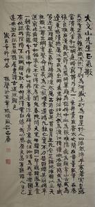 庾振聲是位風格型書家。他的書法作品追求大氣,力避侷促精小,以顯其博大渾穆;追求超邁,力避軟弱浮滑,以顯其精神氣格;追求自然,力避做作牽強,以顯其純真本色;追求拙樸, 力避俗甜姿媚,以顯其深沉典雅;追求氣韻內涵,力避巧飾外露,以顯其神韻自得。這種個性化與境界化較為默契的融合,促使他的創作展現了一種建立在高境界、 高規格基礎上的個性表現。他的作品,用筆遒健,力透紙背,使轉果斷,變化多端,逆側之鋒皆能得心應手、駕馭自如,且潤燥相間,濃淡適宜,境界當在老辣紛披與含蓄蘊藉之間。加上隸書、章草、金文筆意的穿插運用和交替出現,使用筆達到了一種較為熟練且豐富多彩的境界。